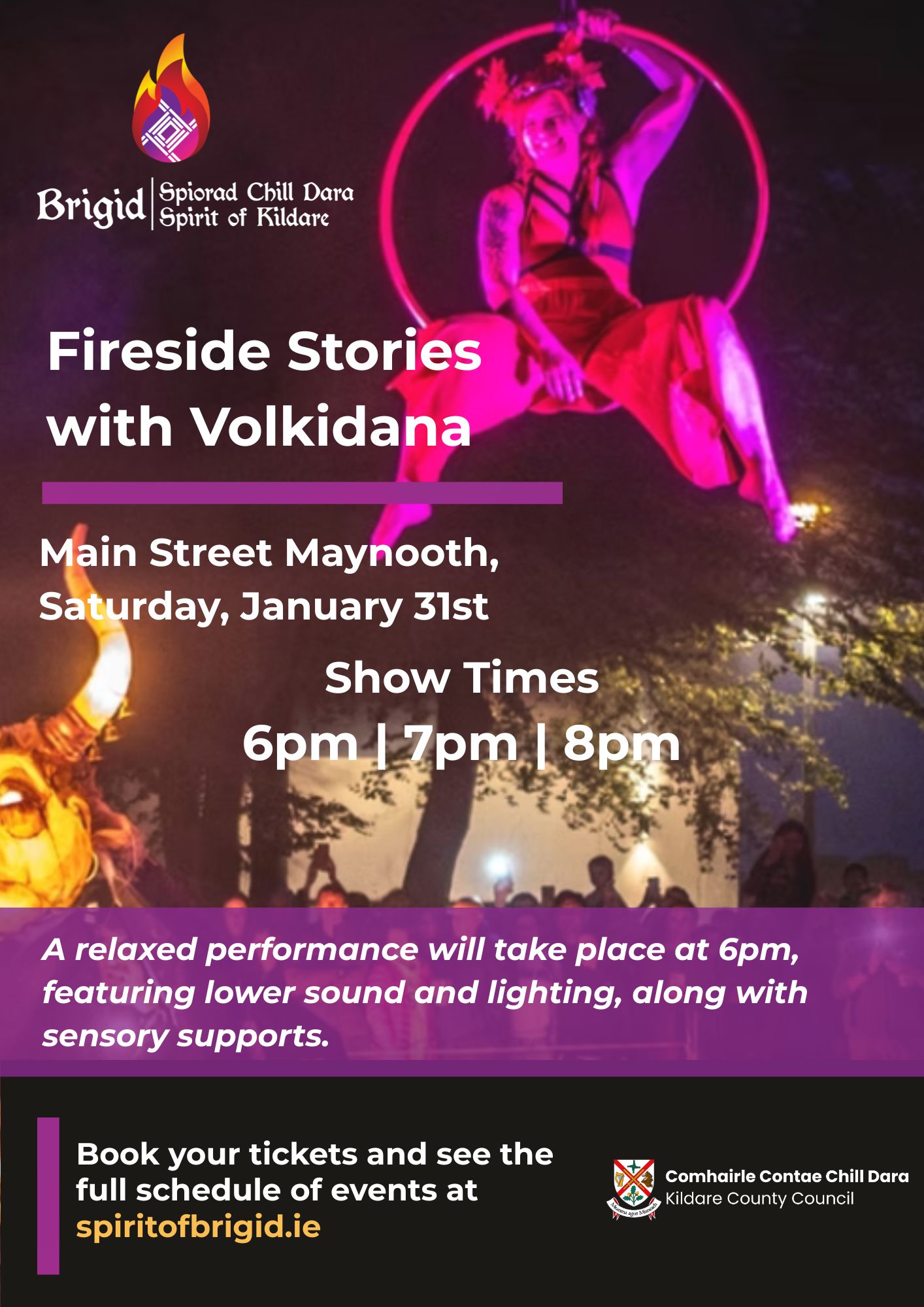 Volkidana brings a breathtaking fireside storytelling spectacle to Maynooth—where myth blazes to life through puppetry, aerial artistry and elemental performance in the tale of the Raiders of Cooley. Expect a legendary tale reborn in sparks, shadow and soaring imagination, inviting audiences of all ages into a world where folklore roars with fire.